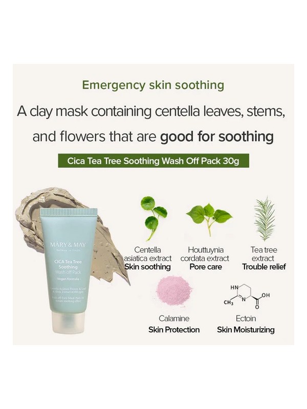 Clay mask for sensitive skin Mary & May CICA TeaTree Soothing Wash off Pack mattifies, eliminates oily sheen and narrows enlarged pores, cleanses, prevents blackheads. The product soothes irritated skin and relieves redness, softens and smoothes. Contains Centella Complex, Houttuynia & Tea Tree Extract, Clay & Calamine.