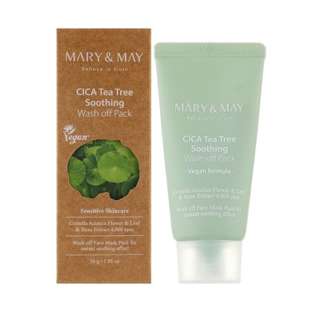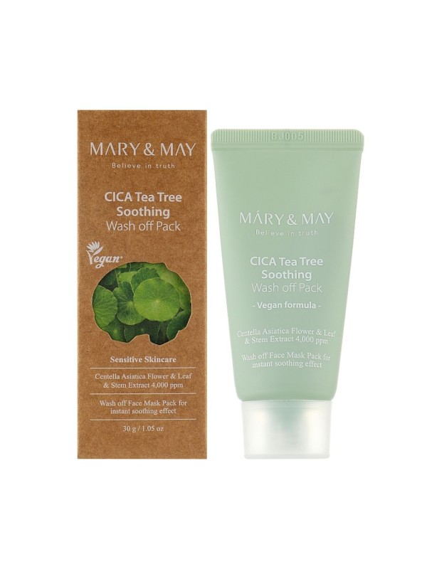 Savimask tundlikule nahale Mary & May CICA TeaTree Soothing Wash off Pakk matistab, kaotab rasuse läike ja ahendab laienenud poore, puhastab, ennetab tedretähne. Toode rahustab ärritunud nahka ja leevendab punetust, pehmendab ja silub. Sisaldab Centella kompleksi, Houttuynia ja teepuu ekstrakti, savi ja kalamiini.